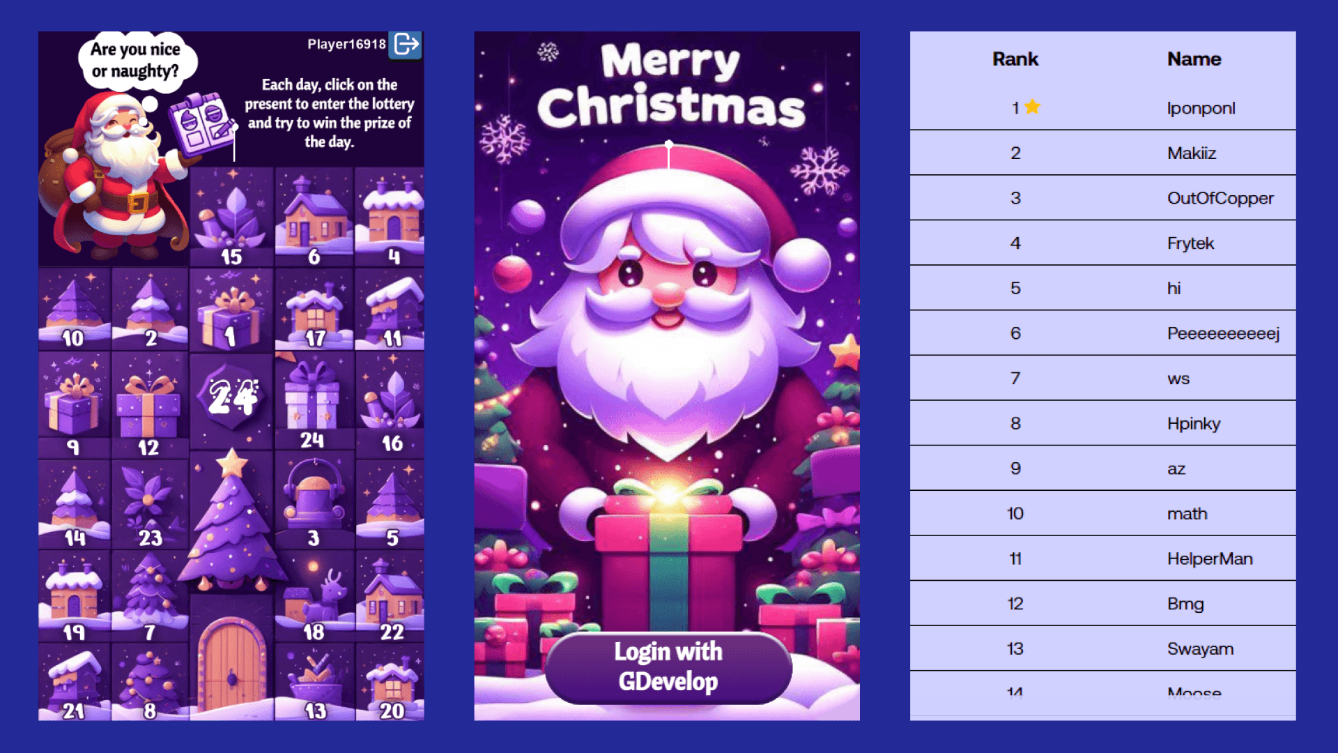This game template showcases the use of GDevelop Auth and the Leaderboard features in an interactive Advent Calendar designed as a promotional game.